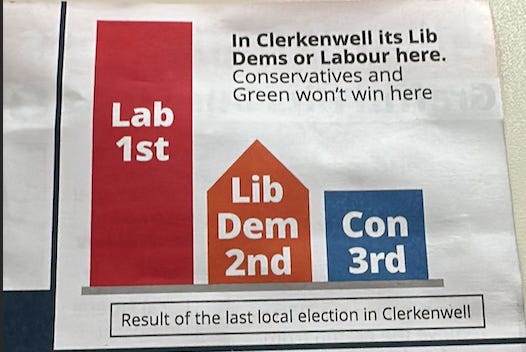 The Lib Dems in particular have been previously accused of using creative diagrams to demonstrate a unique position to overtake Labour. That bar-graph tradition is back in the latest despatch through letterboxes in Clerkenwell, which claims they are the only party that could possibly win against Labour.